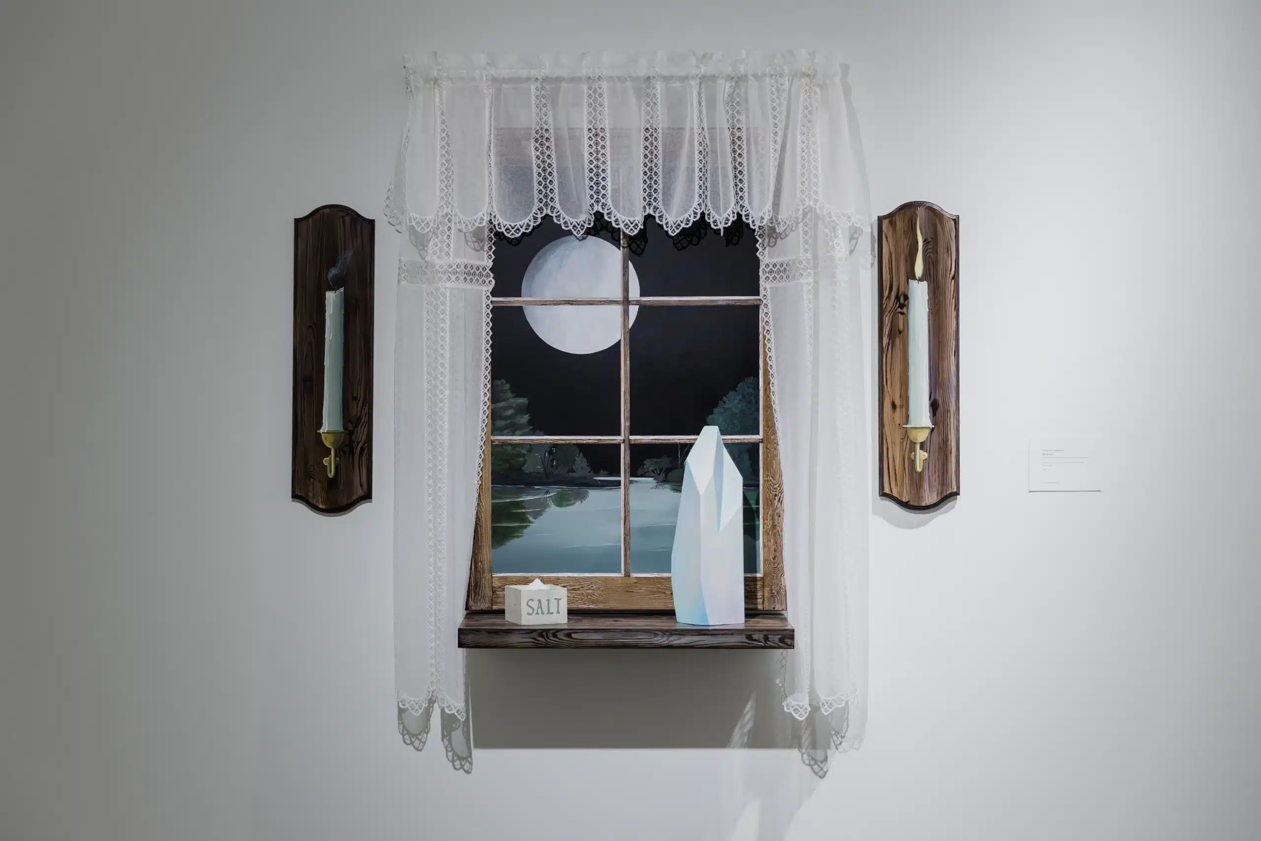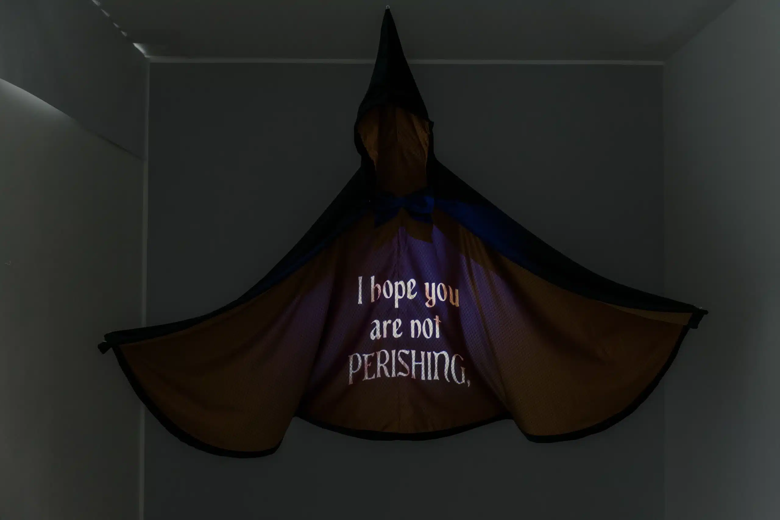 From this correspondence grew a new body of work in which Chaperon experiments with installation and immersive techniques to bring their fictional world to life. Here, the veil between truth and invention is thin: a garment holds hope in; a line of salt on a windowsill wards off evil; a “wobbling rainbow” pulses with creative energy.
