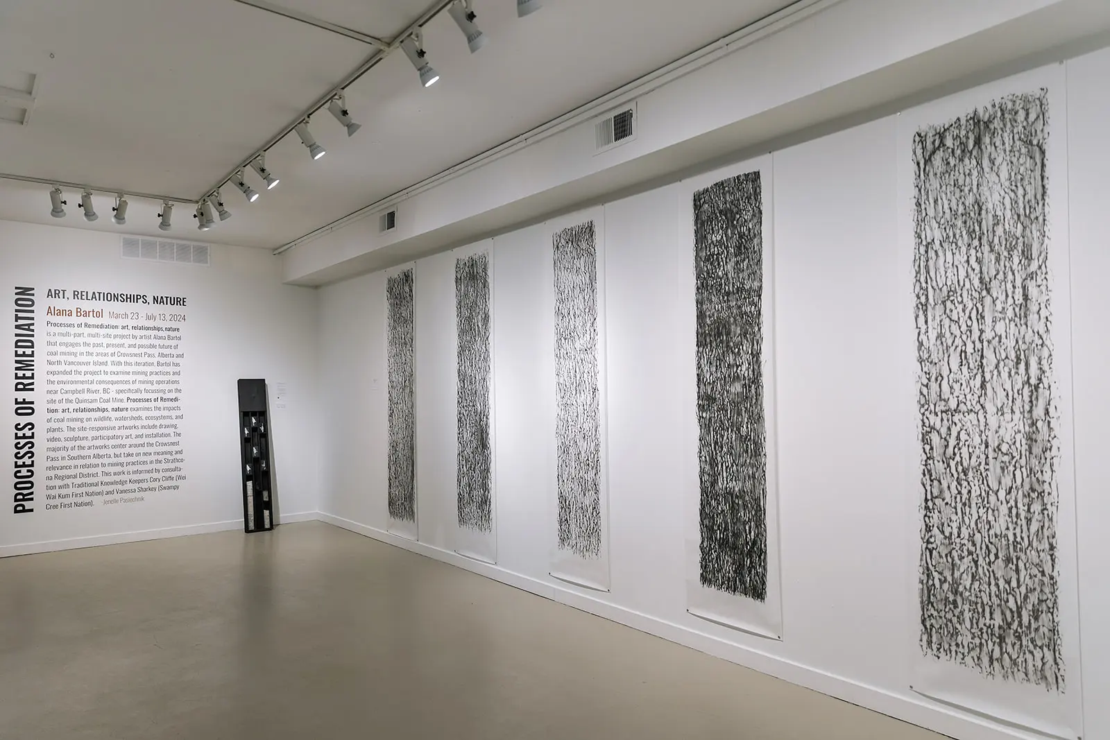 Processes of Remediation: art, relationships, nature is a multi-part, multi-site project by artist Alana Bartol that engages the past, present, and possible future of coal mining in the areas of Crowsnest Pass, Alberta and North Vancouver Island. With this iteration, Bartol has expanded the project to examine mining practices and the environmental consequences of mining operations near Campbell River, BC – specifically focussing on the site of the Quinsam Coal Mine. Processes of Remediation: art, relationships, nature examines the impacts of coal mining on wildlife, watersheds, ecosystems, and plants. The site-responsive artworks include drawing, video, sculpture, participatory art, and installation. The majority of the artworks center around the Crowsnest Pass in Southern Alberta, but take on new meaning and relevance in relation to mining practices in the Strathcona Regional District. This work is informed by consultation with Traditional Knowledge Keepers Cory Cliffe (Wei Wai Kum First Nation) and Vanessa Sharkey (Swampy Cree First Nation).