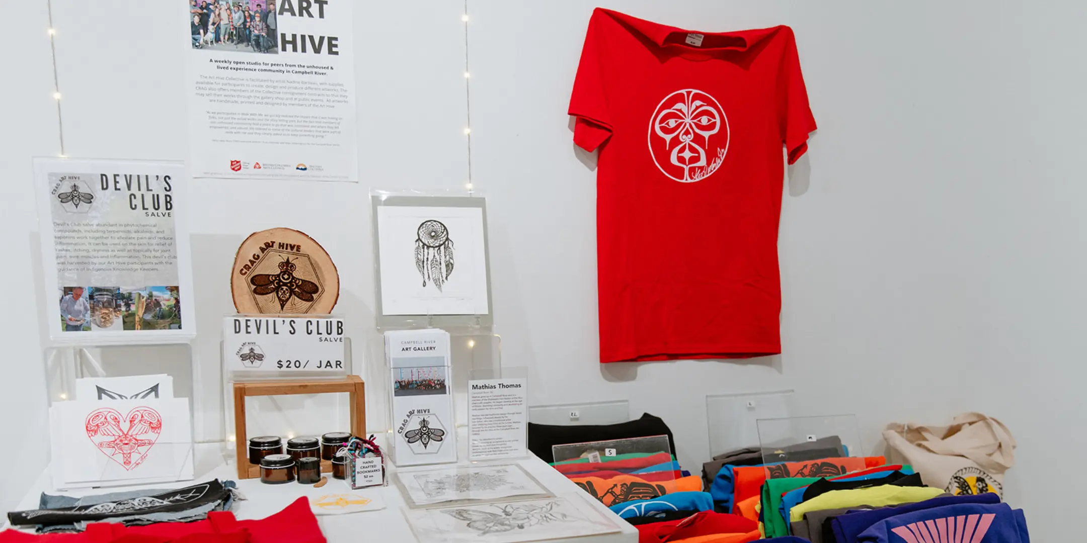 Featuring a collection of carefully curated high-quality fine art from professional and emerging Vancouver Island Artists, as well as locally produced artisan goods, including products made by the Art Hive.